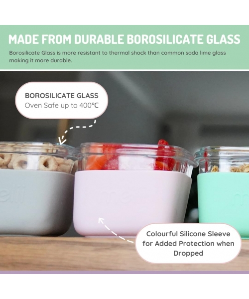 Our glass food storage containers are made from borosilicate glass which is more resistant to thermal shock than the more common soda lime glass. They are dishwasher, freezer, microwave and oven safe, up to 400℃. For an added layer of protection, we added a colourful silicone sleeve to reduce the likelihood of shattering when dropped.
