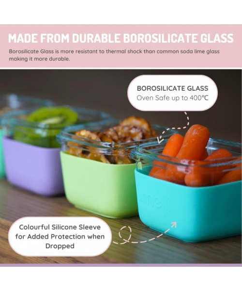 Our glass food storage containers are made from borosilicate glass which is more resistant to thermal shock than the more common soda lime glass. They are dishwasher, freezer, microwave and oven safe, up to 400℃. For an added layer of protection, we added a colourful silicone sleeve to reduce the likelihood of shattering when dropped.