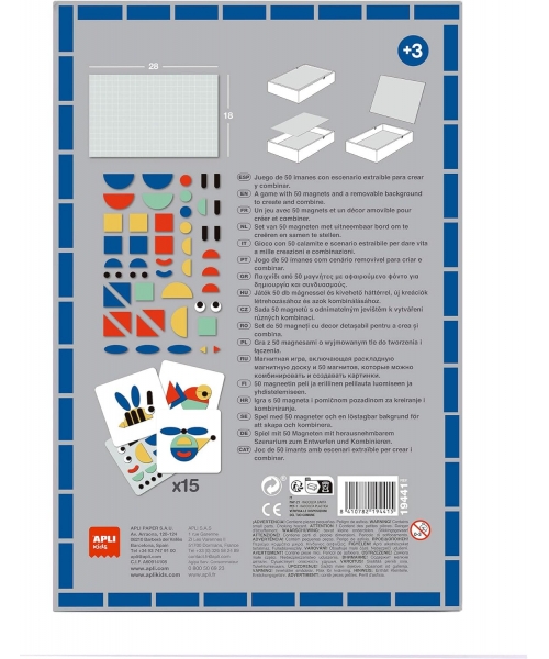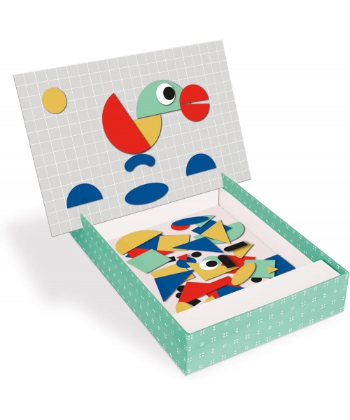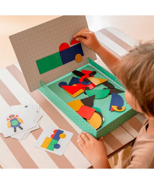 Cardboard magnetic toy, building blocks. The toy includes 15 sample cards and 30 magnetic shapes. The goal is to build different shapes on the magnetic board. The toy helps to develop observation and concentration skills in children.