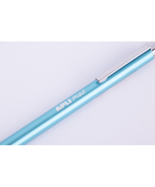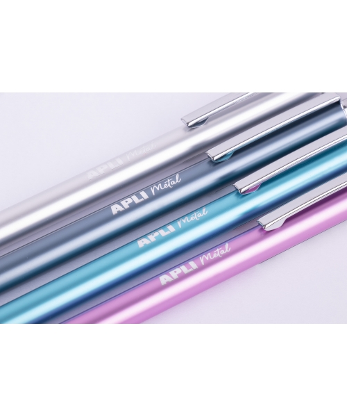 Mechanical pencils in metallic colors: silver, fuchsia, turquoise and blue. With rounded shape and soft texture, very pleasant to touch. Metal cap and eraser.
