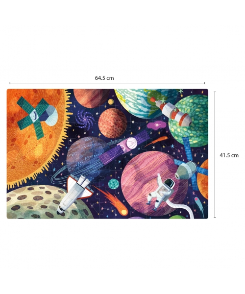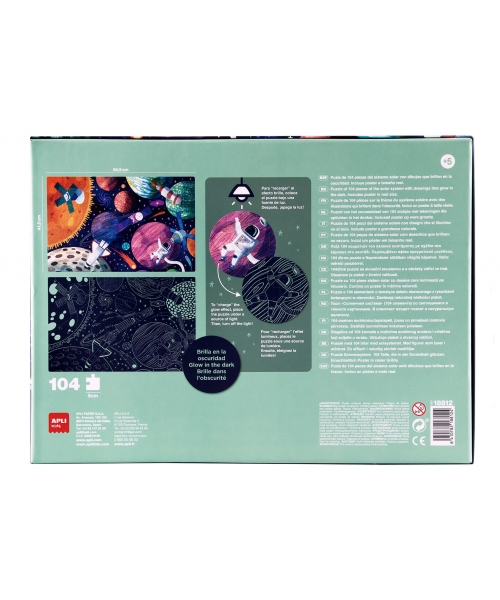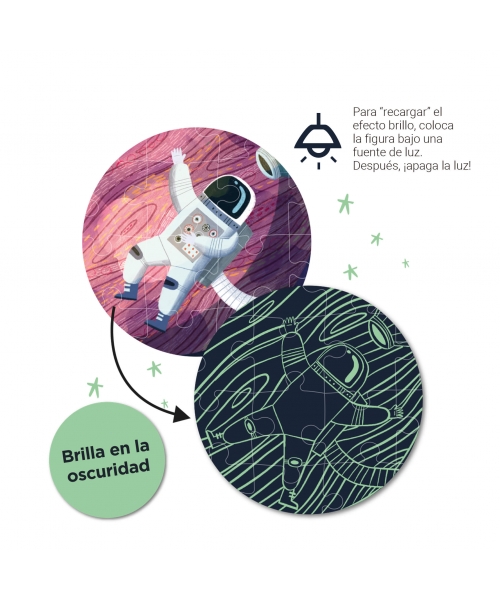 Once the puzzle is assembled, kids can turn off the light to see the planets, stars and satellites glowing in the dark and discover the differences that exist.