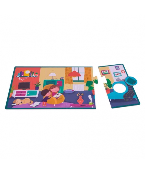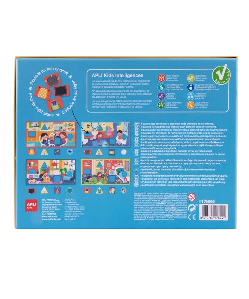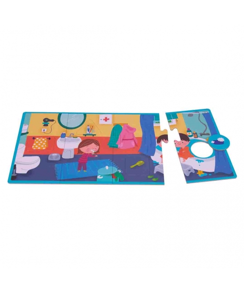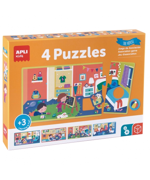 4 puzzles of 4 XL pieces and 4 elements each puzzle. Children have to set the puzzle up and recognize and identify its element in its environment (the bedroom, the bathroom, the kitchen and the living room). It helps to develop the fine motor skills and the concentration. Size: Box - 20,58 x 20,58 mm Puzzle - 36 x 18 cm Piece- 9 x 18 cm