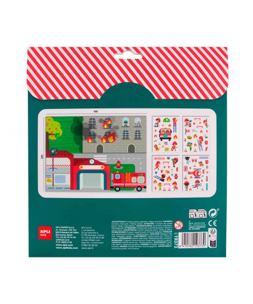 Game of removable stickers with scene of Fire station theme. The game consists of filling the scene with the sticker of the same theme.