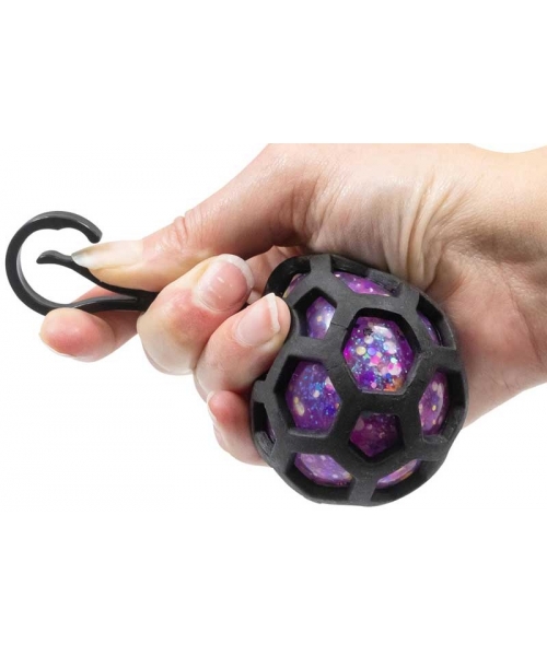 A soothing sensory squishy ball inside a soft honeycomb mesh webbing with a travel keychain accessory.